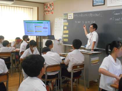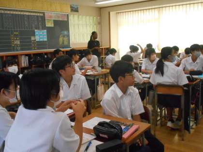 英語の授業では、好きなこと、楽しんでいること、得意なことを伝える活動でした。教育実習生の先生とALTの先生のモデル対話を聞き、自分たちの活動のイメージをふくらませました。