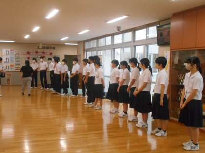 今日は3年2組が生徒玄関エコスペースに立ち、あいさつ運動が行われました。あいさつあふれる毎日にしていきましょう。