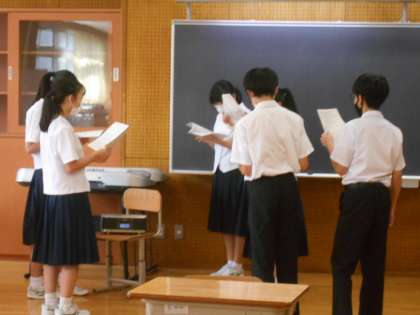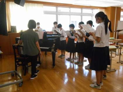 音楽の授業では、合唱コンクールに向けてパート練習が続いています。音取りはパートリーダー中心に進めています。