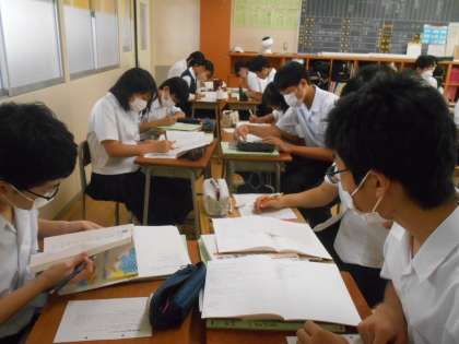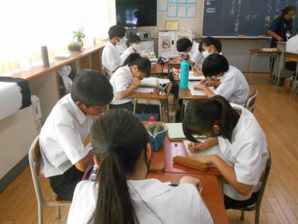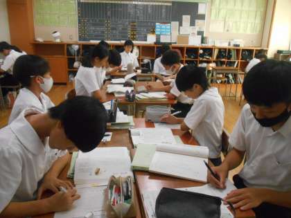 国語の授業では、「盆土産」の学習が一段落し、ワークシートを使って復習していました。