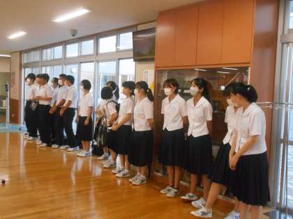 今日の担当は3年4組。登校した人からあいさつ列に加わり、活動をしました。生徒玄関では、お忙しい中、今週もPTAの役員の方々に来ていただき、生徒に声をかけていただきました。本当にありがとうございます。
