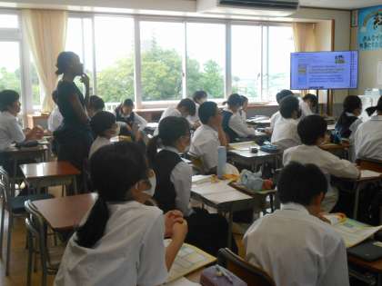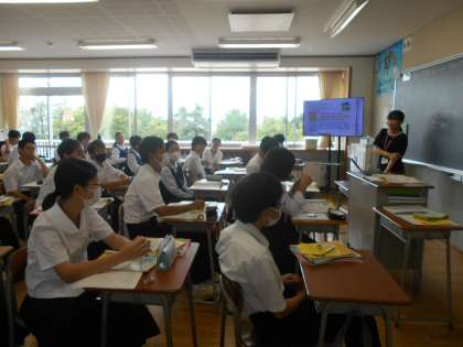 英語の授業では、自分の好きなことについて、どこで、いつ、どのようなといった情報をプラスして伝得ることに、取り組みました。