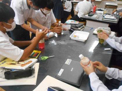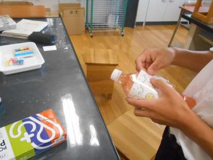 美術の授業で製作しているペットボトルのパッケージが完成したようです。中に入れる水もイメージに合わせて着色していました。