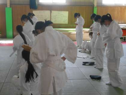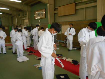 保健体育の授業では、柔道に取り組み始めました。今日は道着の着方から練習です。速く着られるように、帯の結び方もマスターしましょう。