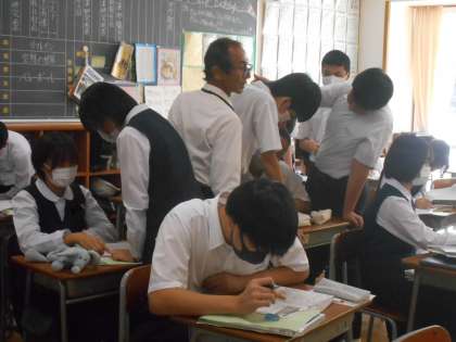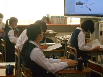 理科の授業では、力の合成について勉強しました。図でかいてみることで、合力というものがイメージできたようです。