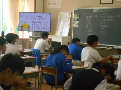 保健体育の授業は、保健分野の授業でした。身の回りにある危険を防ぐために、「ひやりハット」の体験がないか出し合っていました。
