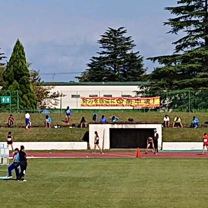 会場には、陸上競技部の横断幕が掲げられ、リレー、800m、1500m等、各種目に臨む際に目を留まり、勇気づけられたのではないでしょうか。結果は満足のいくものばかりではなかったかもしれませんが、これをステップに、次につなげていってほしいと思います。応援ありがとうございました。