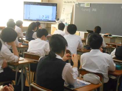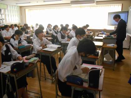 英語の授業では、先生の後についての音読練習をしていました。家でも復習しておきましょう。