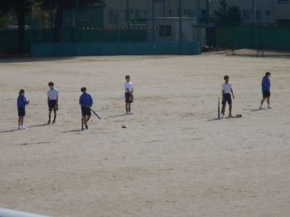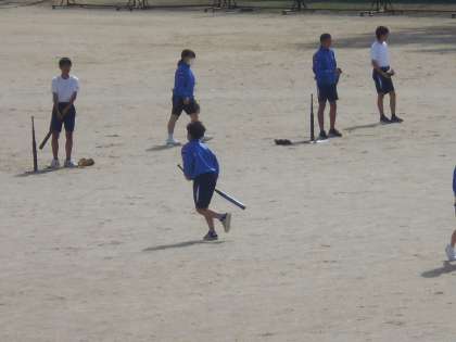 保健体育の授業では、T-バッティングの用具を使ってボールを打ち守備練習をしました。うまくキャッチできたでしょうか。