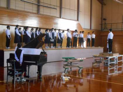 体育館の練習では、隊形及び指揮者、伴奏者の動きも確認できました。明日のリハーサル頑張りましょう。