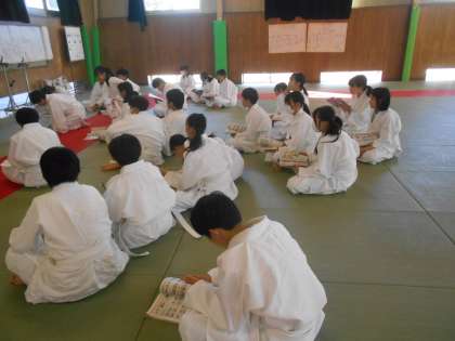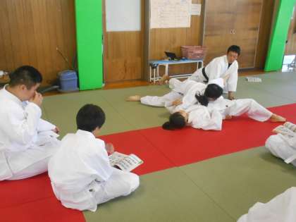 保健体育の授業は、横四方固めの練習でした。モデルの生徒に出てもらい、手の位置や体の位置を確認しました。
