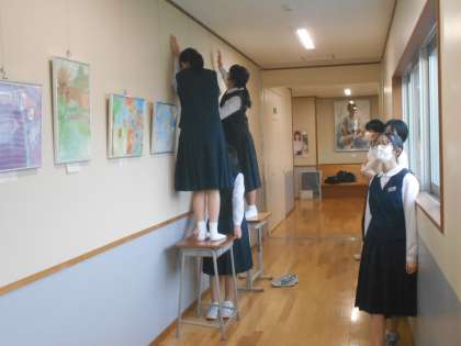 美術部は、今日作品の展示作業をしました。体育館への長い廊下は、美術部の展示コーナーです。当日ぜひご覧ください。