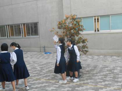 数学の授業では、相似で勉強したことを使って、地上から校舎の高さを測量することに取り組みました。うまく求められたでしょうか。