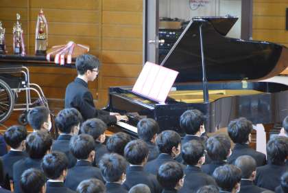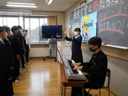 4組は、学級目標「beyond」のもと、『君とみた海』を歌い上げました。学年トップバッターの重責を果たし、出だしの音からクラス一丸となって、一つ一つの音を丁寧に響かせる合唱は、最後の一音まで美しかったです。