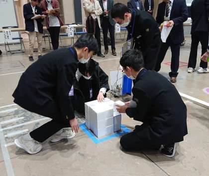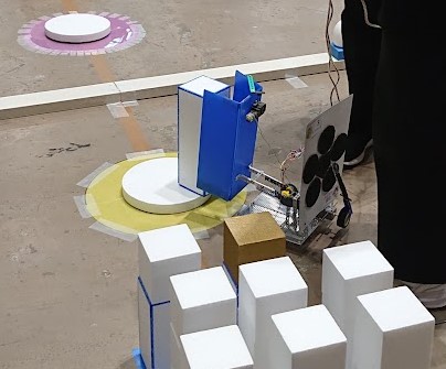 男子4人で挑んだチーム「ビギナーズ」のロボットは、ブロックを両側からしっかり挟みこむタイプのロボットでした。安定した運びで点数を重ね、予選Cリーグ1位で通過し、決勝トーナメントに進みました。試合の合間にロボットの整備をしながら試合に臨み、見事3位入賞を果たしました。