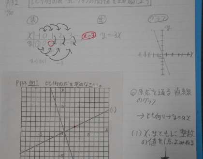 数学の授業では、比例の表、式、グラフの関係を考えました。どんなことが分かったのでしょうか。