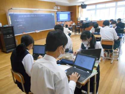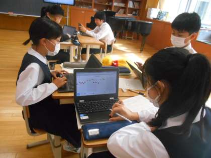 音楽の授業では、作曲ソフトを使って、メロディー作りをしました。思い思いの音を設定していました。どんな曲になったのでしょう。