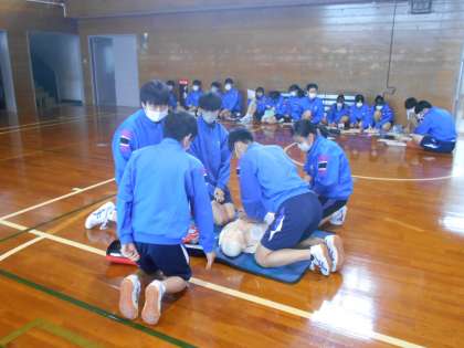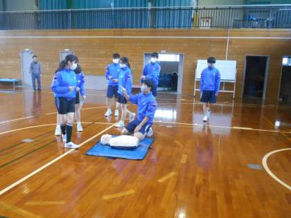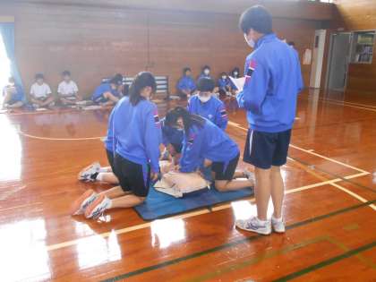 保健体育の授業では、実際に訓練用の人形を使い、救命救急法について勉強しました。体を動かして取り組む経験がいざというときに役立ちます。