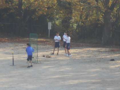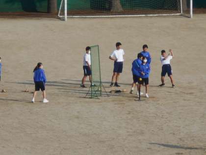 保健体育の授業では、T-バッティングの用具を使ってボールを打ち、守備練習をしていました。