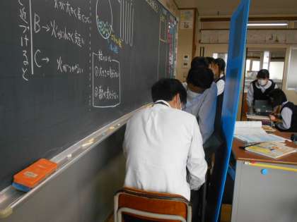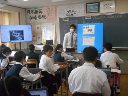 理科の授業では、ワインに火が付いた理由を説明することに取り組みました。考えがまとまった人から解答の部屋で先生に聞いてもらいました。