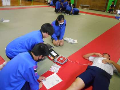 保健体育の授業では、AEDの使い方を人形を使って練習をしました。実際に自分がAEDを触って手順を確認することは、何より大切です。