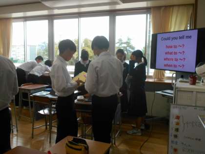 英語の授業では、知って得する情報をhow to〜等を使って詳しく聞き出すことに取り組みました。楽しそうに会話していました。