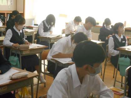 英語の授業でも、テストが返され、解説を聞きながら自分のつまずきを振り返りました。丁寧に見直し、練習し直すべきことを見付けておきましょう。
