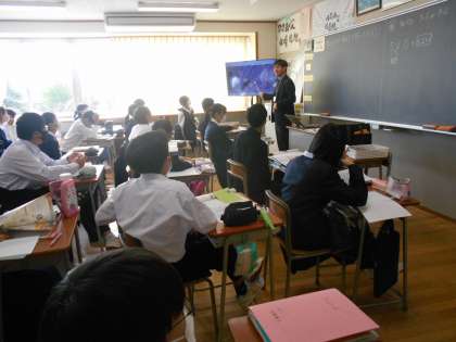 英語の授業では、クイズに答えながら、物を尋ねる表現を練習しました。面白いクイズがたくさんあって、楽しそうにやりとりをしていました。