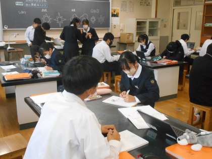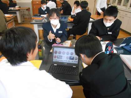 美術の授業では、オリジナル文様作りを進めています。資料集やネットでの情報を見ながら、原画にする素材を考えている人も見られました。