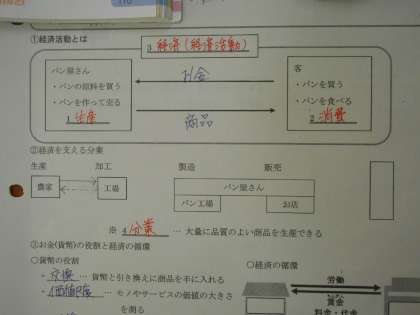 社会の授業では、ワークシートを使って、お金の役割や経済の循環について勉強しました。