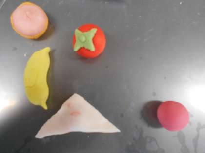 美術の授業で制作している紙粘土の作品です。細かな作業を楽しみながら、本物そっくりに仕上げた人もいました。おいしそうですね。