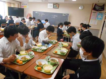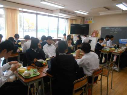 今日は、合唱コンクール校内最優秀賞を獲得した学級の給食に、混ぜてもらいました。生徒のみなさんと食べる給食は、とっても楽しい時間でした。いろいろな質問にも答えてもらい、生徒のみなさんの声を聞く機会にもなりました。招待してくれてありがとう!