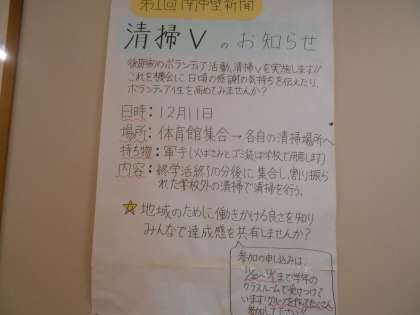 12月11日(月)に行う清掃Vについてのお知らせが掲示されていました。学校近辺のみの清掃となりますが、地域のためにぜひ協力しましょう。
