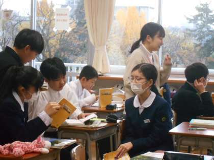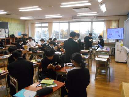 英語の授業では、テスト範囲の単語について問題を出し合い、復習をしました。日本語から英語に、英語から日本語にスムーズにできたでしょうか。