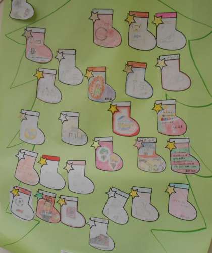 このクラスでは、季節が変わる時期にいつも新しい掲示物が作られます。今回は、クリスマスに合わせたメッセージカードが作られました。描くことや貼り出すことで、楽しい気持ちも倍増します。