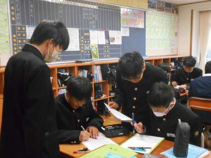 数学の授業では、班ごとにこれまでの復習となる問題に取り組みました。学び合いが定着しています。