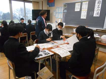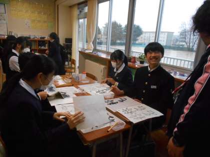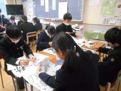 国語の授業では、水筆で書き初めの練習をしました。墨汁で制服等を汚さず、何度も練習できるので安心して練習できるようです。