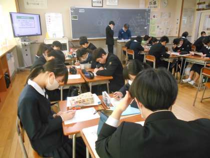 数学の授業では、復習問題に取り組んでおり、できた人から先生にチェックしてもらっていました。