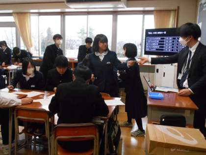 社会の授業では、班対抗で価格の違う製品をいくつ売るかを考え、一番多く稼いだのはどの班かを競っていました。どんなふうに売るのでしょうか。