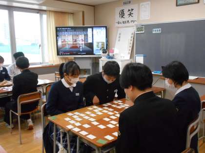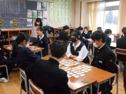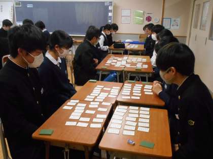 国語の授業では、百人一首大会に向けて練習をしました。みんなよい笑顔が見られ楽しそうでした。来学期の本番では頑張ってください。