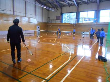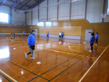 女子ソフトテニス部は、外での活動ができないため、体育館の半面を使って練習をしました。冬休み中は、このような練習が多いかもしれません。