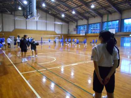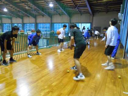 バスケットボール部は、ドリブルとシュートの練習です。男子は、小さいボールとバスケットボールを使って、同時二刀流で練習をしていました。