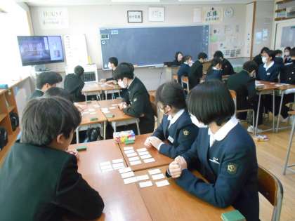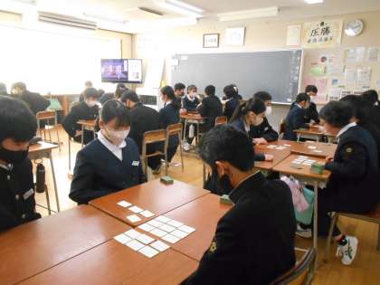 国語の授業では、1月19日の本番に向けて、百人一首の練習をしました。一首でも上の句で取ることができるとよいですね。