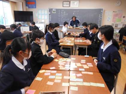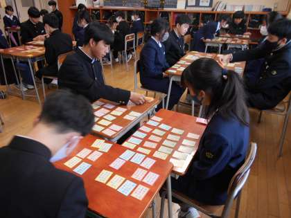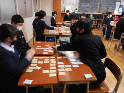 国語の授業では、百人一首の練習をしました。今週末の大会本番に備えて、頑張りましょう。