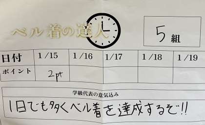 チャイム二分前着席に取り組む「ベル着の達人」が本日から一週間行われます。冬休み明けですが、余裕をもって授業に取り組めていました。