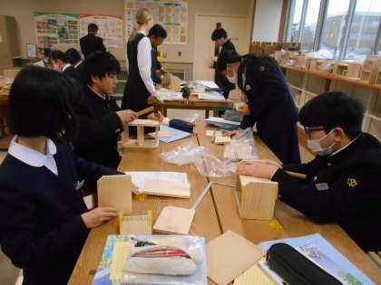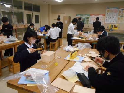技術の授業での木製本立て作りの様子です。慎重に板を合わせて、釘打ちをしていました。