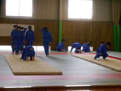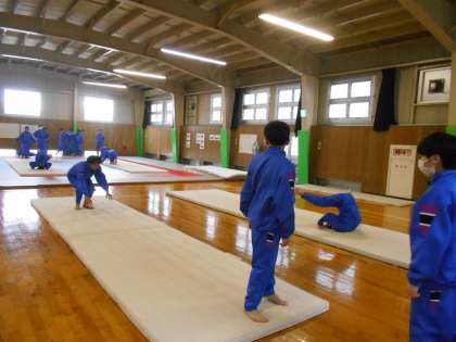 保健体育の授業は、マット運動に入りました。まずは、足の開き方、手の置き方から練習です。