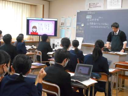 家庭科の授業では、消費者トラブルの事例を知ることで、だまされないように勉強しました。具体的な場面が想像できる事例に、みんな聞き入っていました。