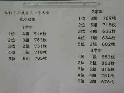 先週行われた百人一首大会の結果が掲示されていました。各クラス全員の力を合わせての結果です。どの教室でも楽しい時間を過ごせたことが思い出されますね。来年も楽しみましょう。