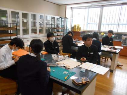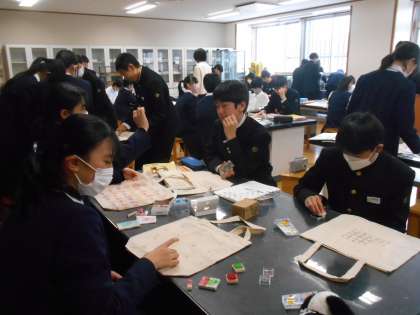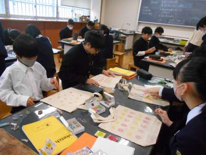 美術の授業では、完成したゴムはんこをバックにプリントしました。完成間近ですね。